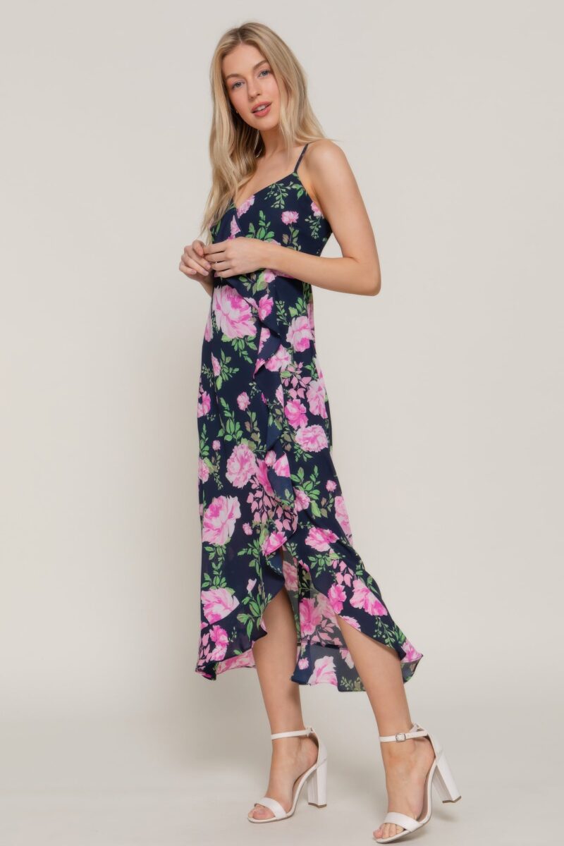 Romantic and effortlessly elegant, this floral printed ruffle slip midi dress is designed to turn heads with its flowing silhouette and delicate details. Featuring slender straps and a softly draped fit, it flatters the figure while offering lightweight comfort. The ruffle accents add a playful, feminine touch, and the midi length creates a graceful, versatile shape. Crafted from 100% polyester, this dress is perfect for garden parties, brunch dates, or warm-weather evenings out.