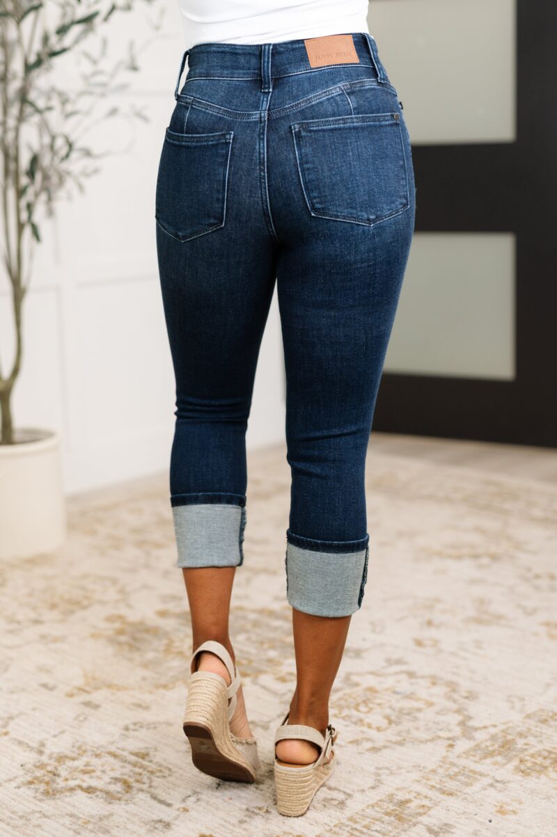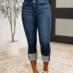 Elevate your style with Karen High Rise Double Waist Band Capri Jeans. The high rise and double button waistband provide a flattering fit, while the dark wash adds a touch of edge. These capri length jeans also feature an optional cuffed hem for a versatile look. Stay on trend with their skinny fit. (Jeans, but make it fashion!)